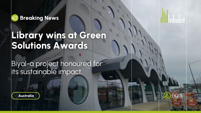 Biyal-a Armstrong Creek Library is one of two Egis projects to win at the Green Solutions Awards, which recognise and promote exemplary sustainable building, district, and infrastructure projects combatting climate change.