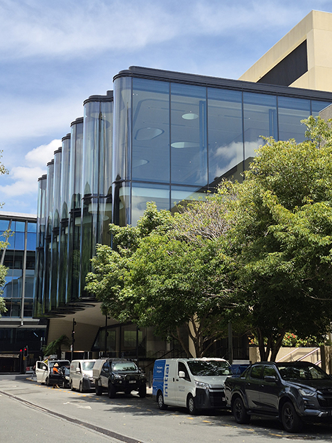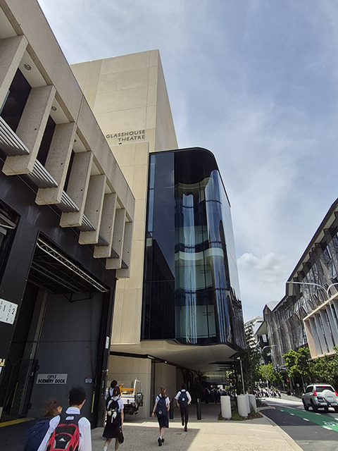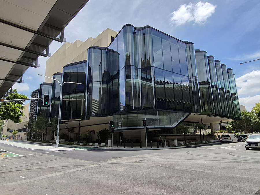 A new AU$150 million theatre in Brisbane, Australia, features an interpretive curtain of curved glass enveloping the building, creating a sense of the whole building as theatre. The texture and shape of the riparian façade, and the materials used, reference the water’s edge at nearby Kurilpa Point on the Brisbane River.